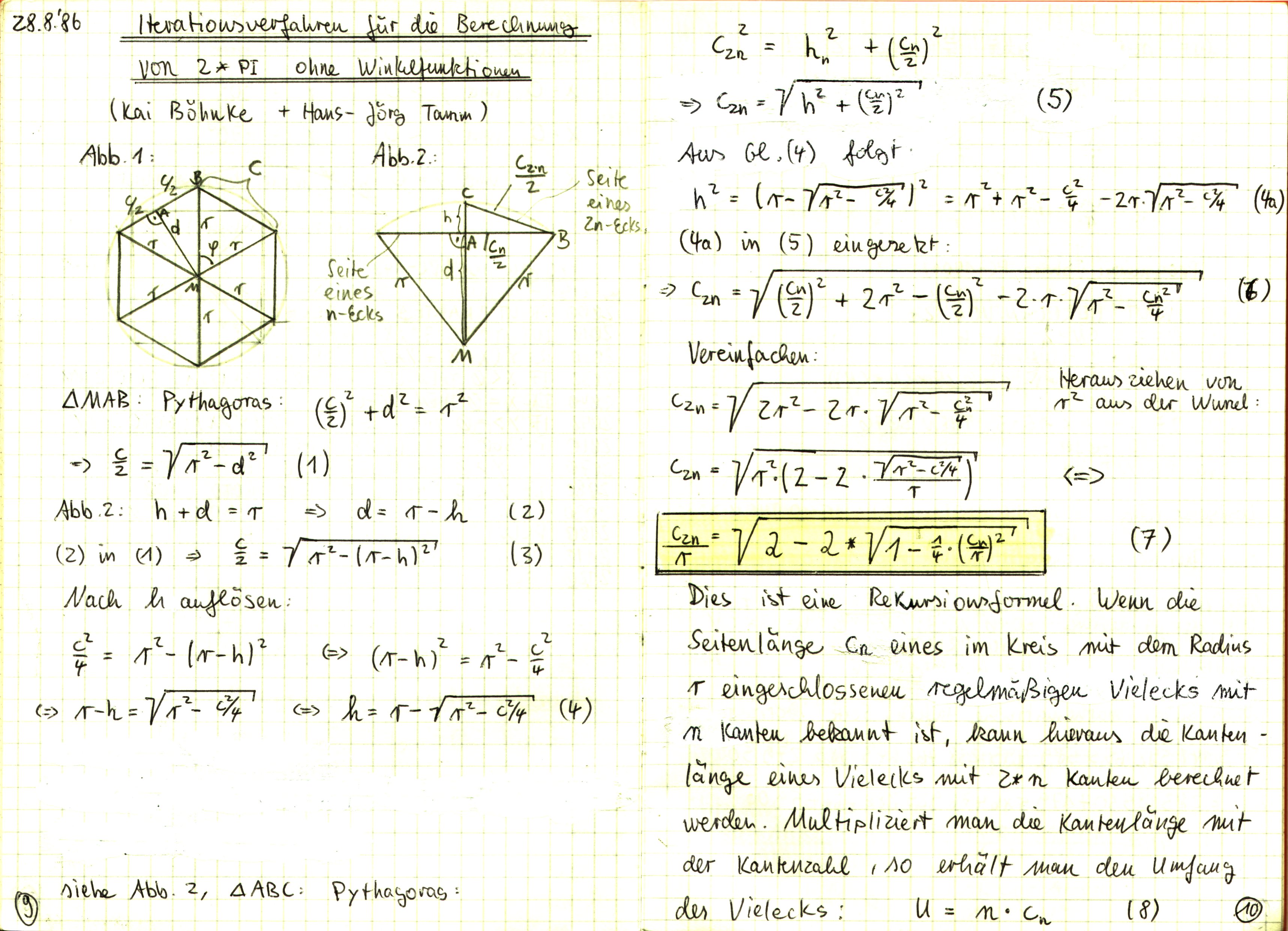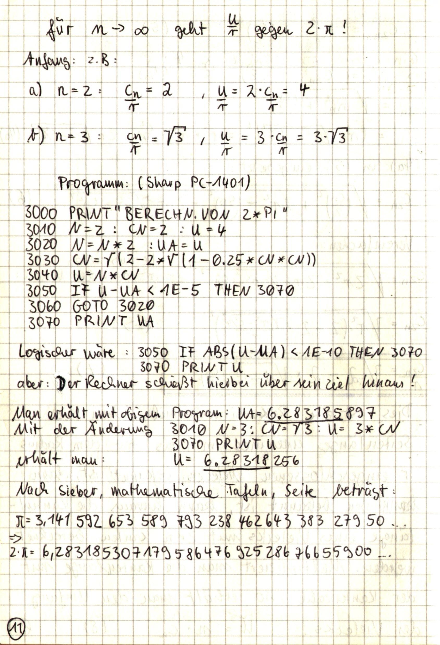 | Geometrie : Kreiskonstante Pi | Iterationsverfahren für die Berechnung von 2*Pi ohne Winkelfunktionen, mit BASIC-Programm für Sharp PC-1401. |