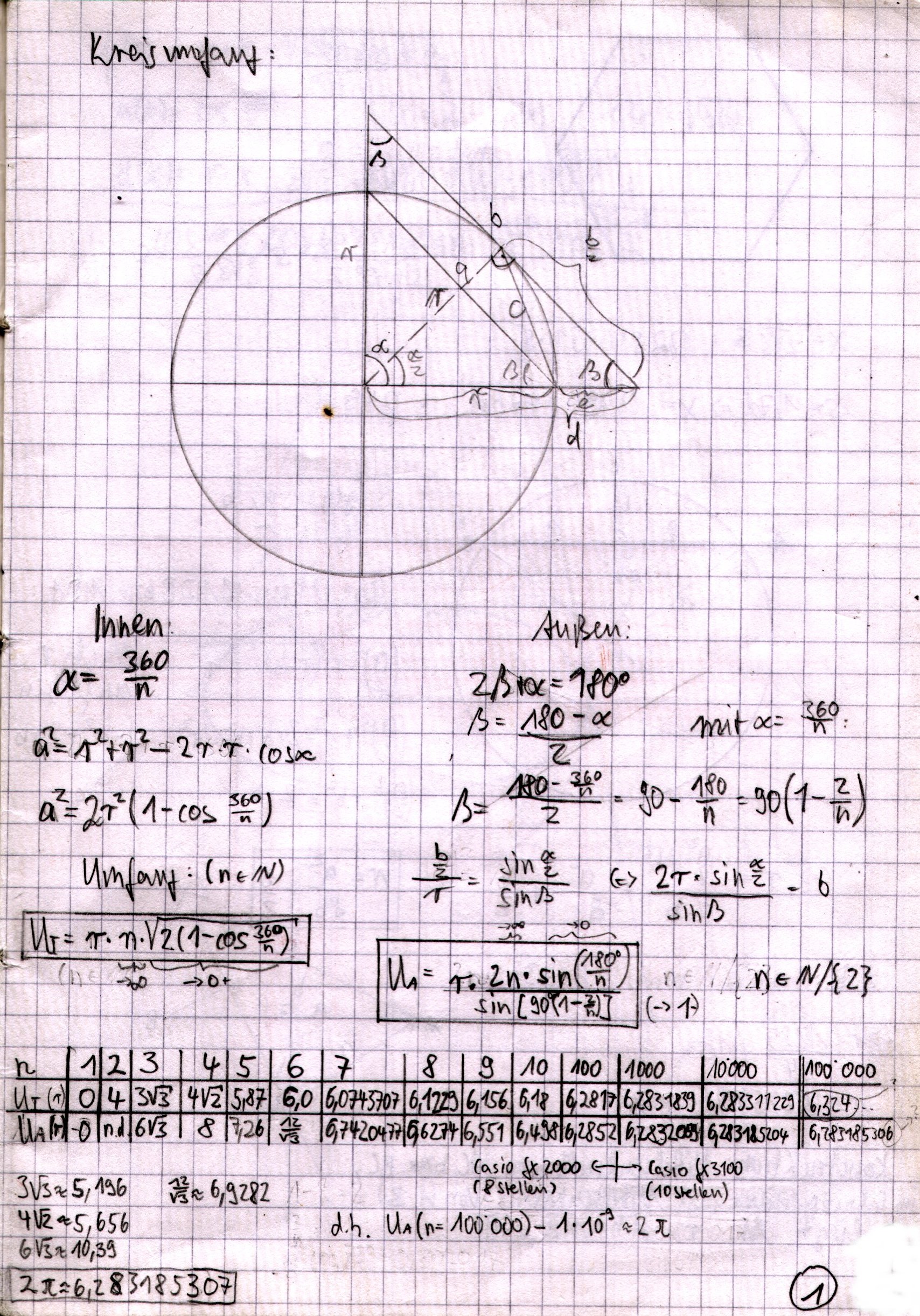 | Geometrie : Kreisumfang | Berechnung des Kreisumfangs nach Innen-und Aussen-Vieleck - Grenzwerte Pi (Kreiskonstante) |