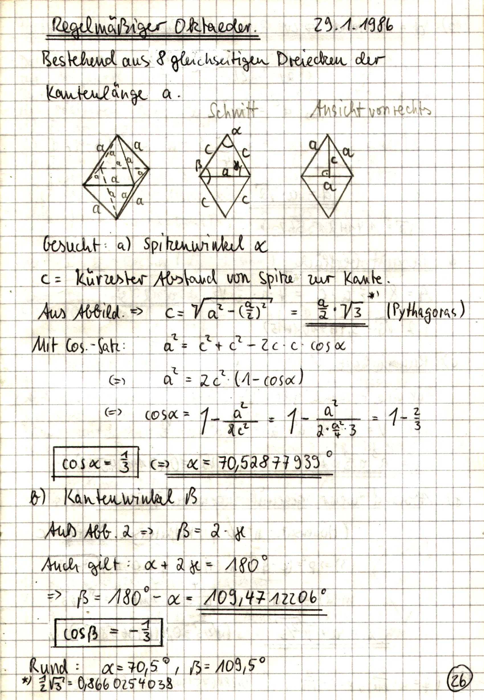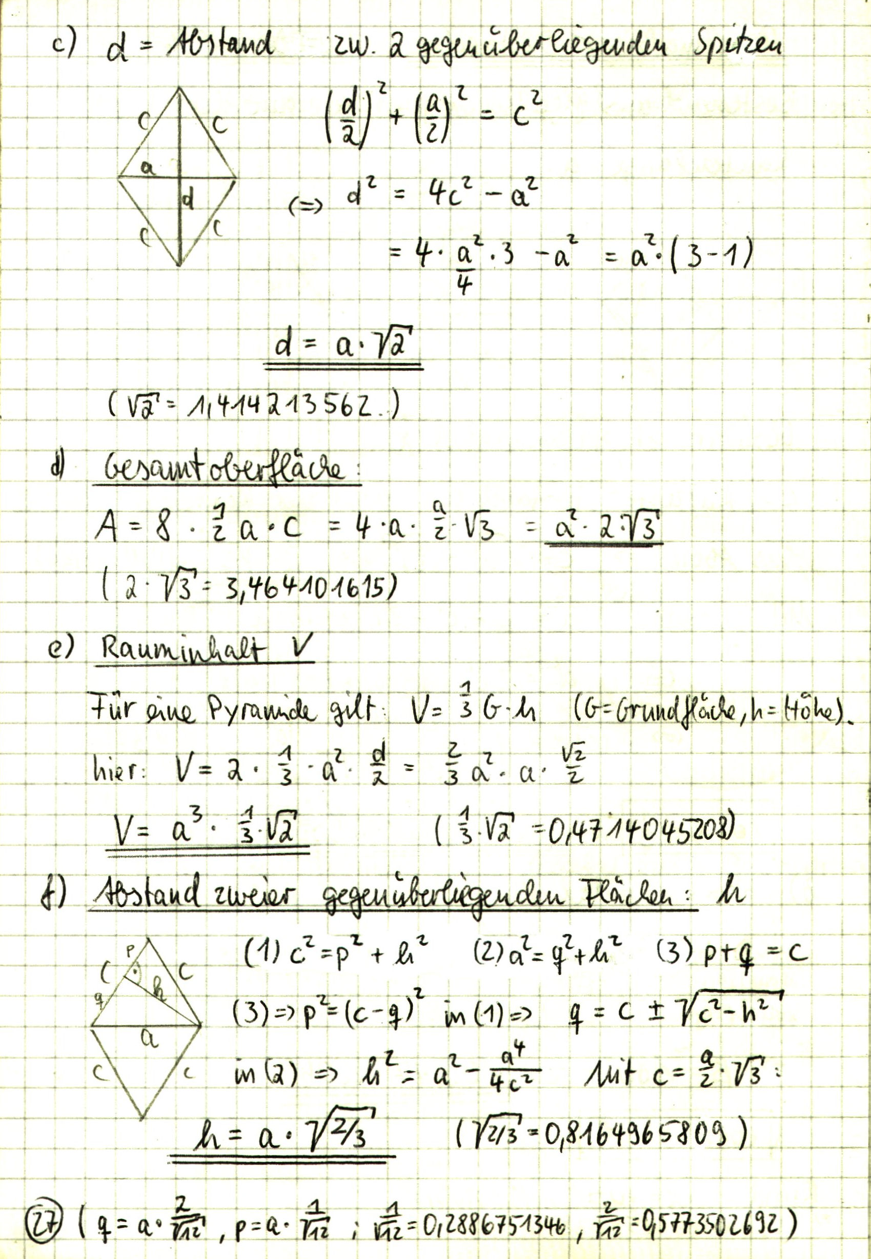 | Oktaeder | Oktaeder : Spitzenwikel, Kantenwinkel, Abstand 2er gegenüberliegenden Spitzen, Gesamtoberfläche, Rauminhalt, Abstand 2er gegenüberliegenden Flächen. |