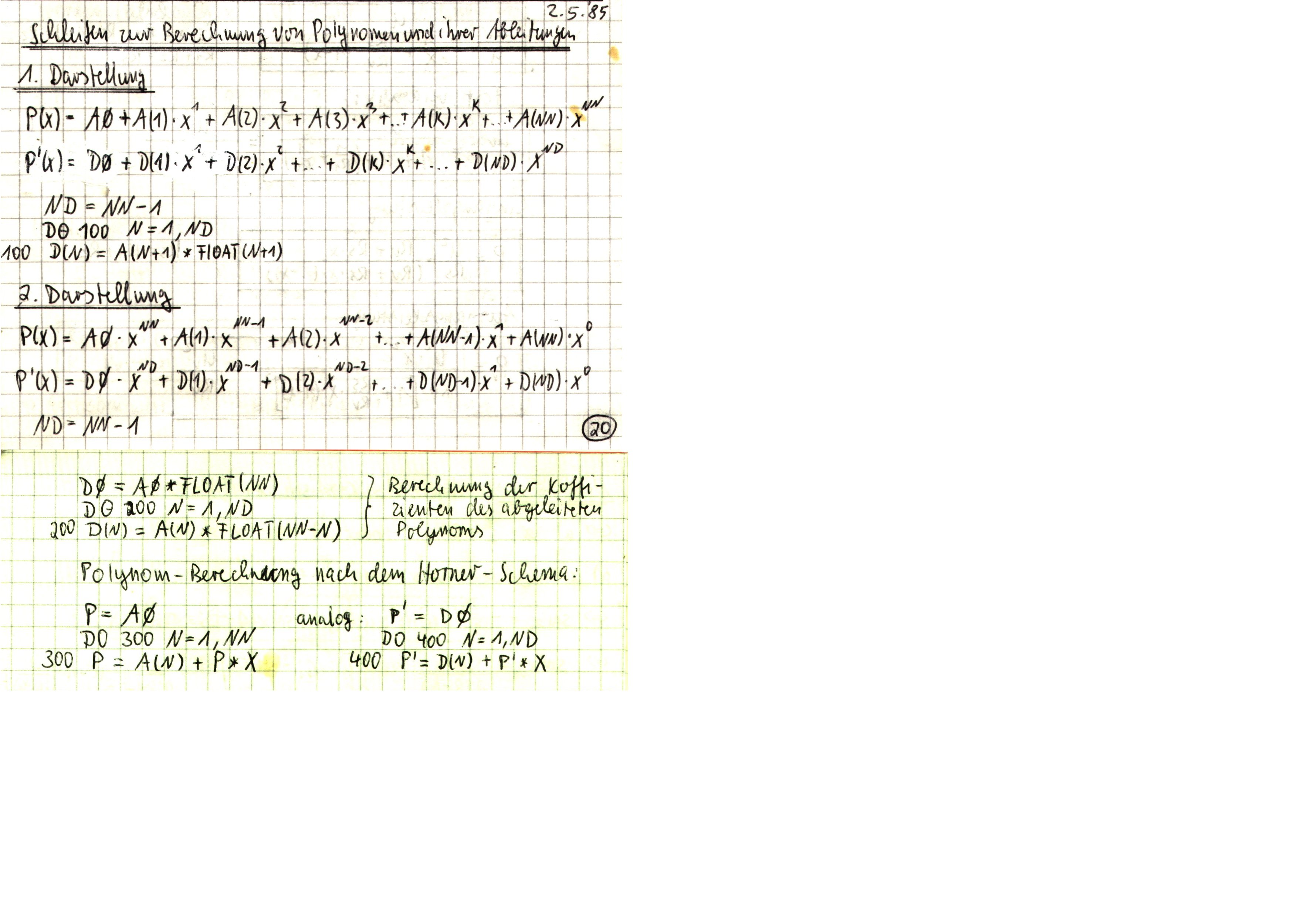 | Analytik : Polynome | Schleifen in FORTRAN zur Berechnung von Polynomen und deren Ableitungen nach dem Horner-Schema. Die FLOAT-Funktion konvertiert Integer(ganze Zahlen) zu Real-Zahlen. |