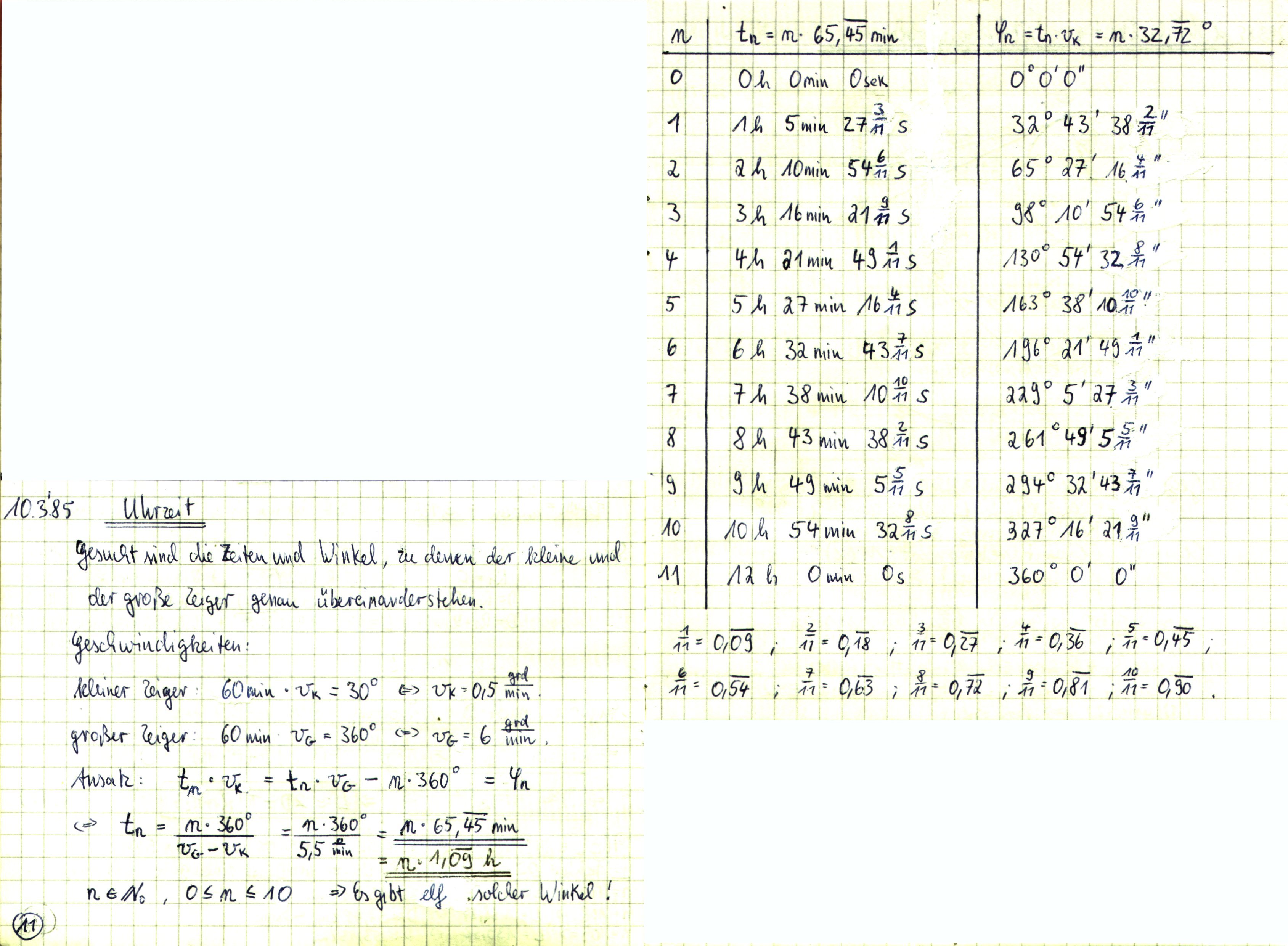 | Uhrzeiger und Uhrzeit | Zeiten und Winkel auf einer Uhr, zu denen der große und der kleine Zeiger genau übereinstimmen (übereinander liegen). |