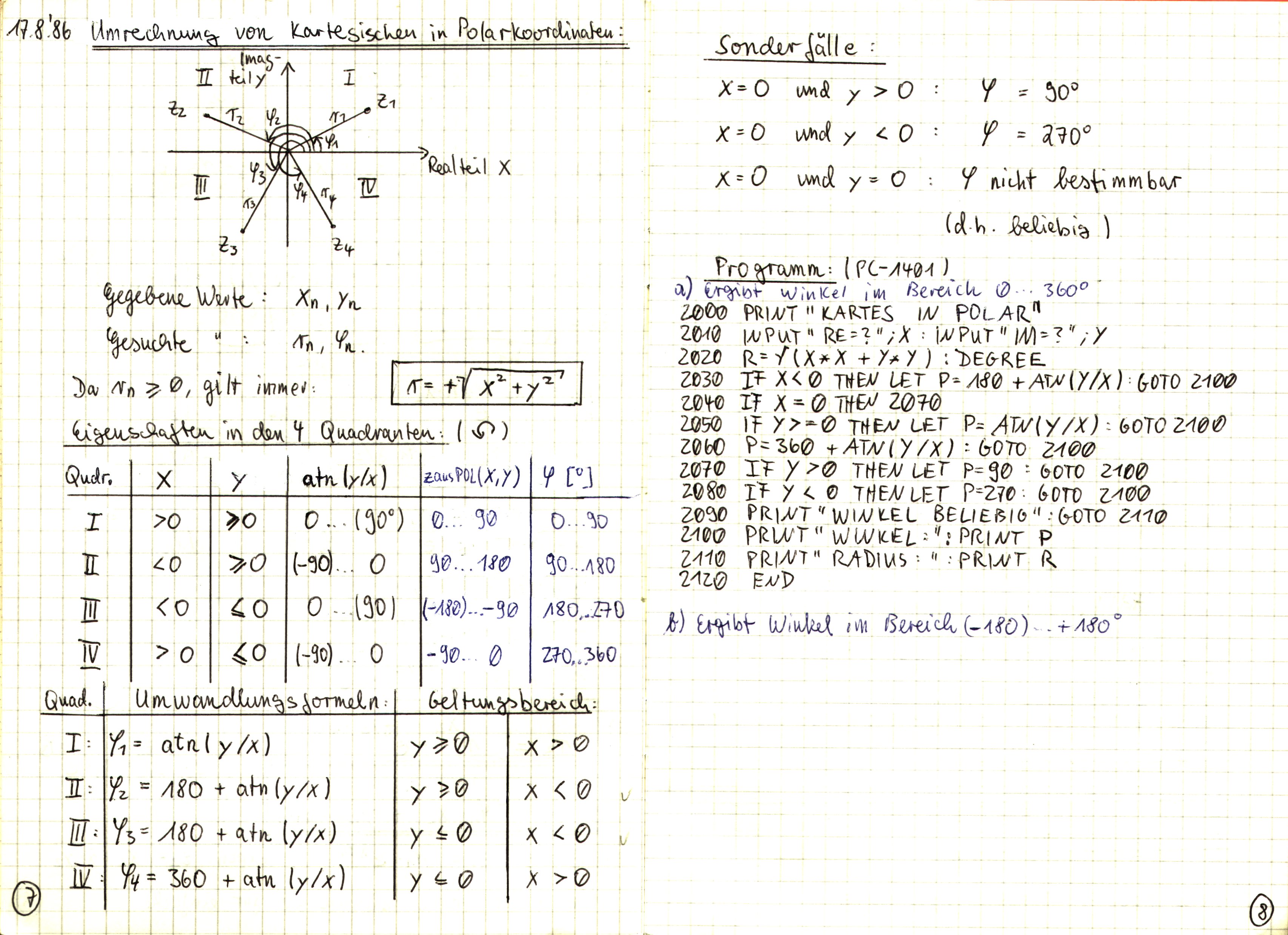 | Koordinatenumrechnung | Umrechnung von kartesischen Koordinaten zu Polarkoordinaten mit BASIC-Programm für Sharp PC-1401. |