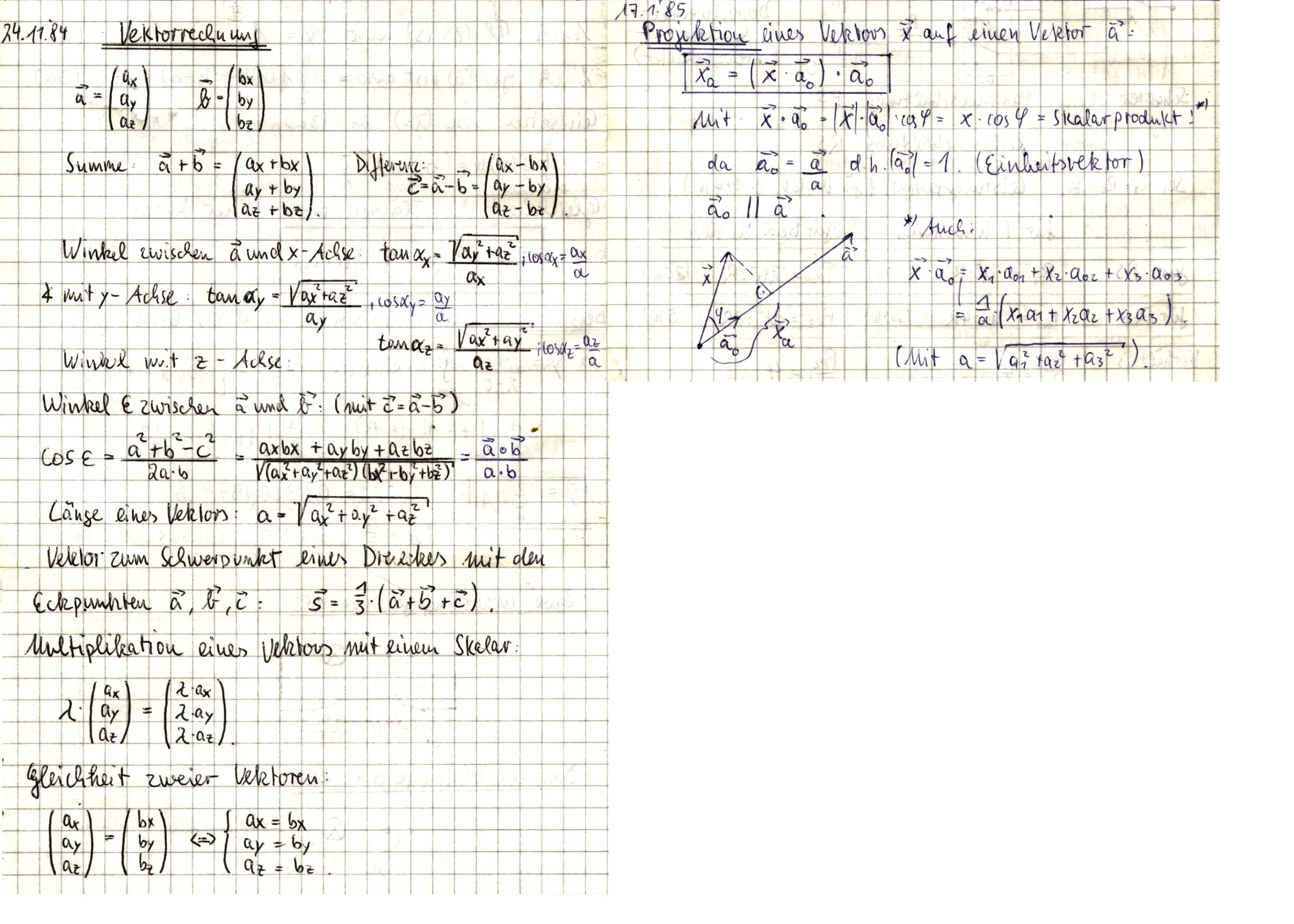 | Vektorrechnung | Vektoren : Summe, Differenz, Winkel, Länge, Multiplikation mit einem Skalar, Gleichheit, Projektion. |